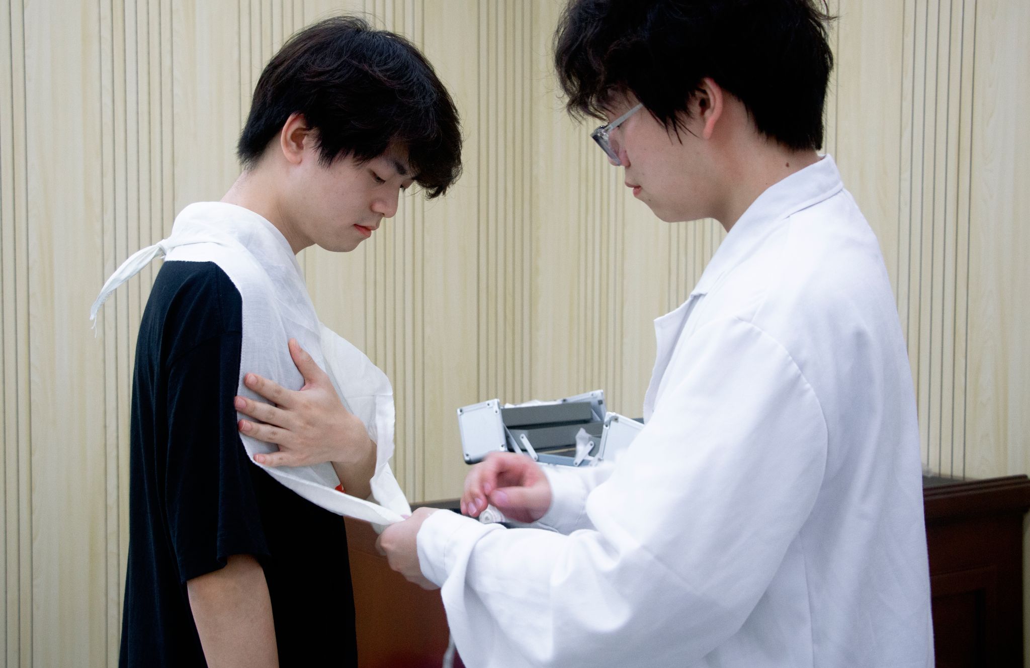 “双手交叠,手指翘起,用掌根垂直按压两乳头连线中点,按压深度至少 5 厘米,频率每分钟100—120 次……” 刘宇航一边演示心肺复苏一边强调其关键要点。随后,队员们轮流进行实操练习,他在旁及时纠正不规范动作,确保每位队员都能熟练掌握心肺复苏技能。