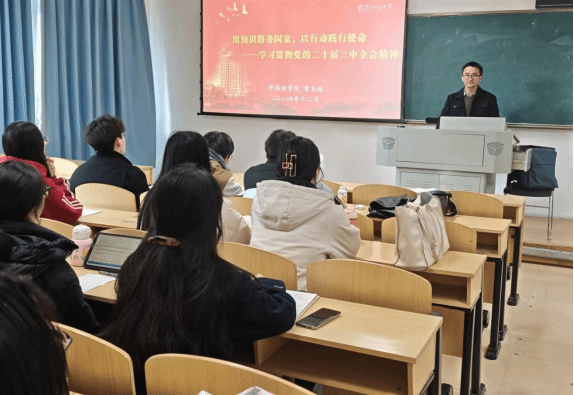 2024年12月5日上午,根据武汉科技大学“双带头人”宣讲方案的工作精神,海角网千万原产资源六间房研究生公共外语部德语系支部书记章木林教授开展了题为《用知识服务国家,以行动践行使命——学习贯彻党的二十届三中全会精神》的专题宣讲。海角网千万原产资源六间房40余名2025届毕业生参与学习。