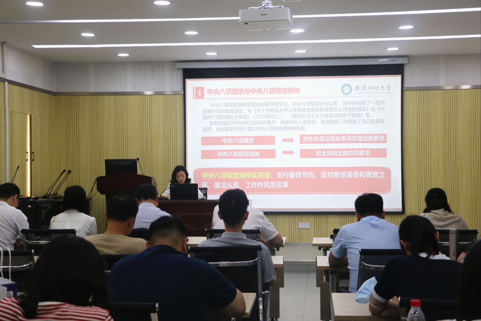 会上,学院党委书记郑娟以《锲而不舍深入贯彻中央八项规定精神,持续推进作风建设取得新成效》为题讲授专题党课,传达了中央层面深入贯彻中央八项规定精神学习教育工作专班、中央纪委办公厅“关于河南省信阳市、罗山县10名干部在学习教育期间违规吃喝、严重违反中央八项规定精神问题”的公开通报,与会同志集中观看了警示教育片。