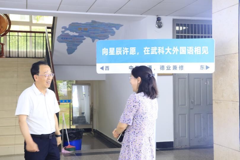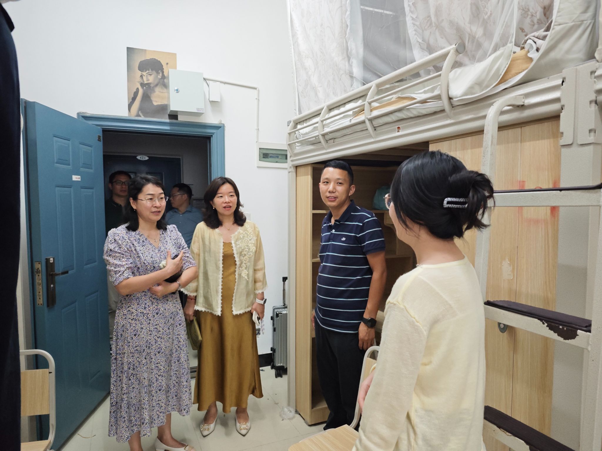 随后,校院领导一行前往北区研究生宿舍看望新生。在宿舍内,领导们关切询问新生生活用品配备、住宿适应情况,并结合武汉初秋早晚温差较大的气候特点,提醒新生及时添衣保暖。同时,领导们重点强调宿舍用电安全,明确要求新生避免使用大功率电器,杜绝安全隐患;此外,还鼓励新生珍惜同窗情谊,在生活中互帮互助、在学业上共同进步,合力营造安全、和谐、向上的宿舍氛围。