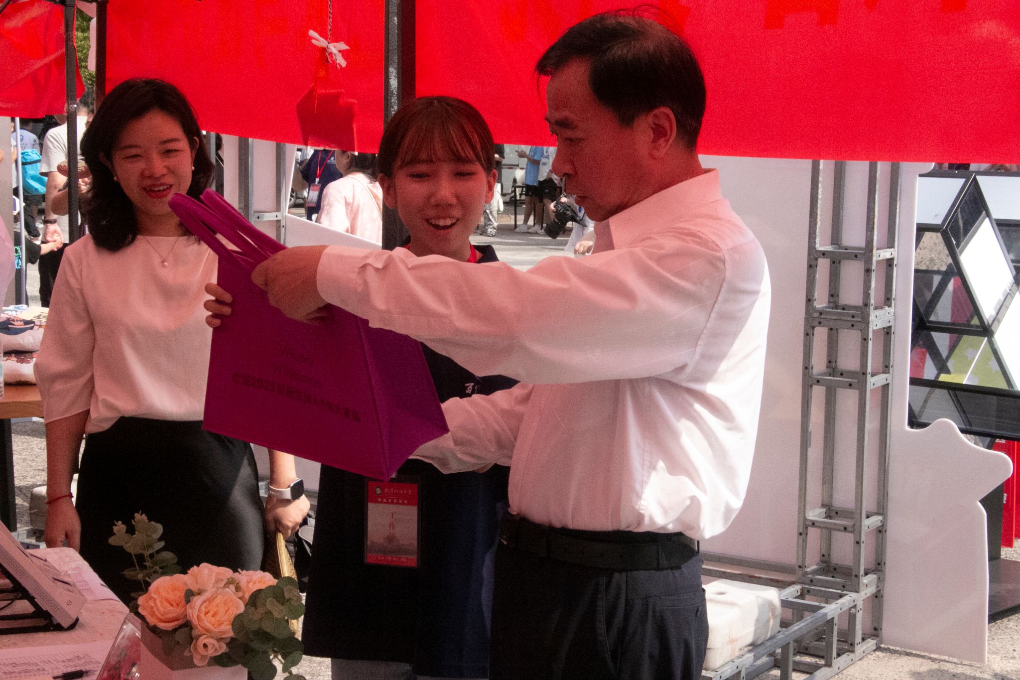 孙国胜仔细询问我院新生报到情况,并与新生亲切交谈,了解他们的家乡、兴趣爱好以及对大学生活的期待。学院党委书记郑娟、2025级本科生辅导员刘麒向孙国胜汇报了我院迎新工作。今年学院围绕“以文化人、以情暖心”的理念,为每位新生准备了印有英文与德语双语欢迎词的学院定制毛毡包,同时在迎新现场也同步开展了英语问答小游戏和中英双语对联打卡活动。此外,为加强家校联系、畅通沟通渠道,学院创建了2025级家校合作微信群,并为家长精心准备了《致家长的一封信》。