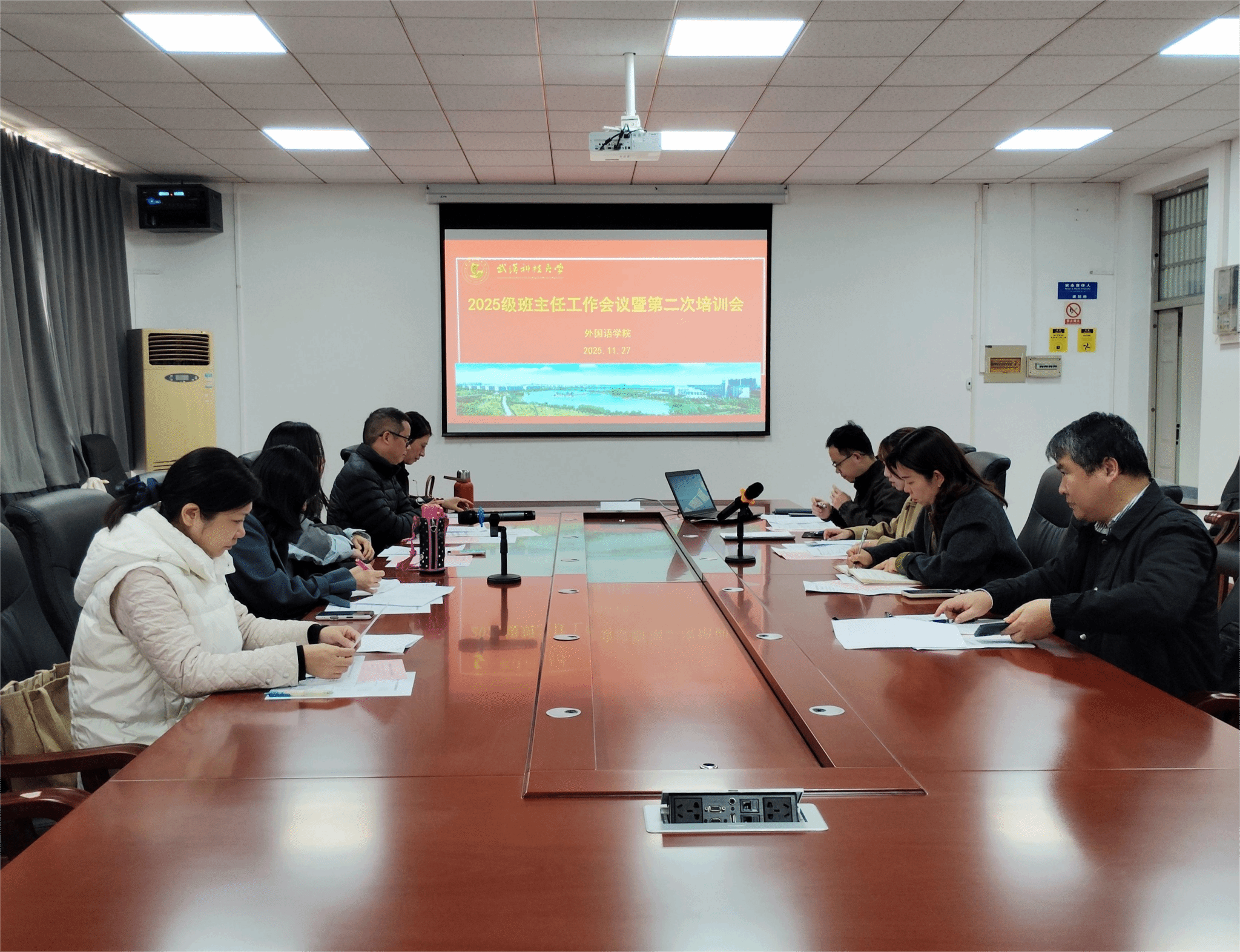 本网讯(通讯员 陈凌)11月27日下午,我院在教四楼二区404教室召开2025级班主任工作会议暨第二次培训会,旨在凝聚育人合力、强化班主任职责、创新工作方法,为学院人才培养工作提供坚实保障。我院党委书记郑娟、副院长陈尧、英语2501班班主任沈国环、英语2502班班主任李旎、英语2503班班主任谭思蓉、英语2504班班主任肖志清、德语2501班班主任徐小清、2022级辅导员兼学院学生工作办公室主任吴晨晨参会,会议由2025级本科生辅导员刘麒主持。