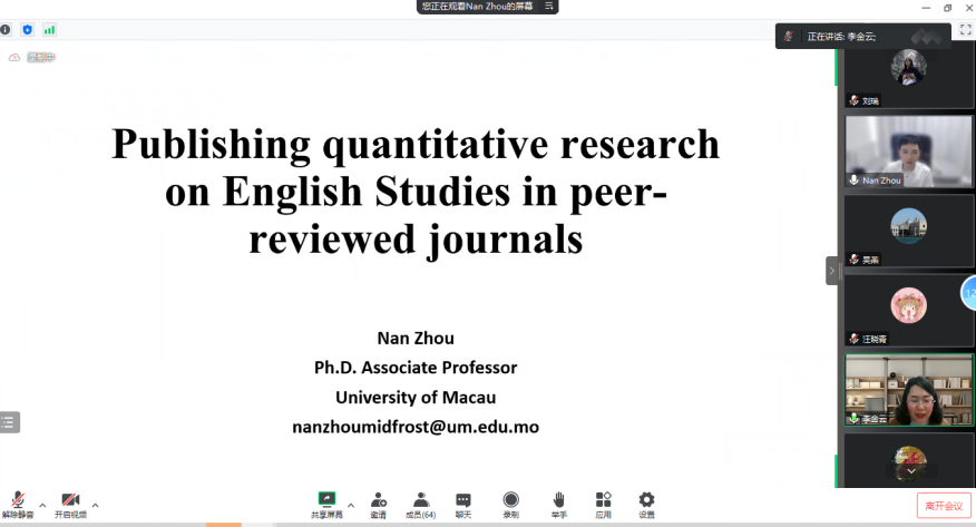 武科大网讯(通讯员刘瑞 姚刚)3月23日下午,应我院邀请,澳门大学教育学院副教授、博士生导师周楠于线上给我院师生带来一场题目为“量化研究方法在外语教育研究中的应用”的学术讲座。此次讲座由副院长李金云主持,我院部分教师及全体研究生参加了本次讲座。