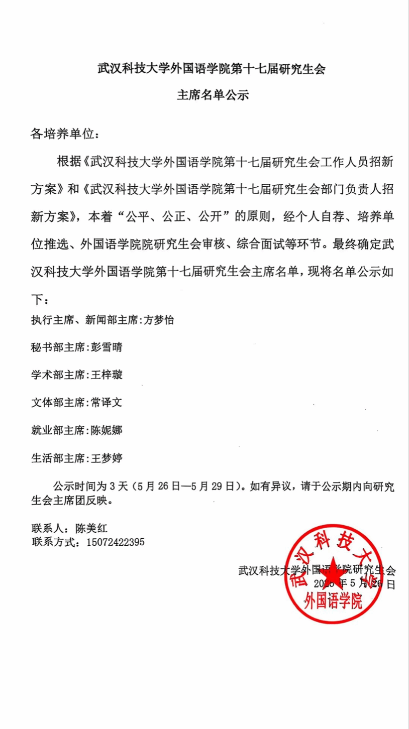 武汉科技大学海角网千万原产资源六间房第十七届研究生会主席名单公示